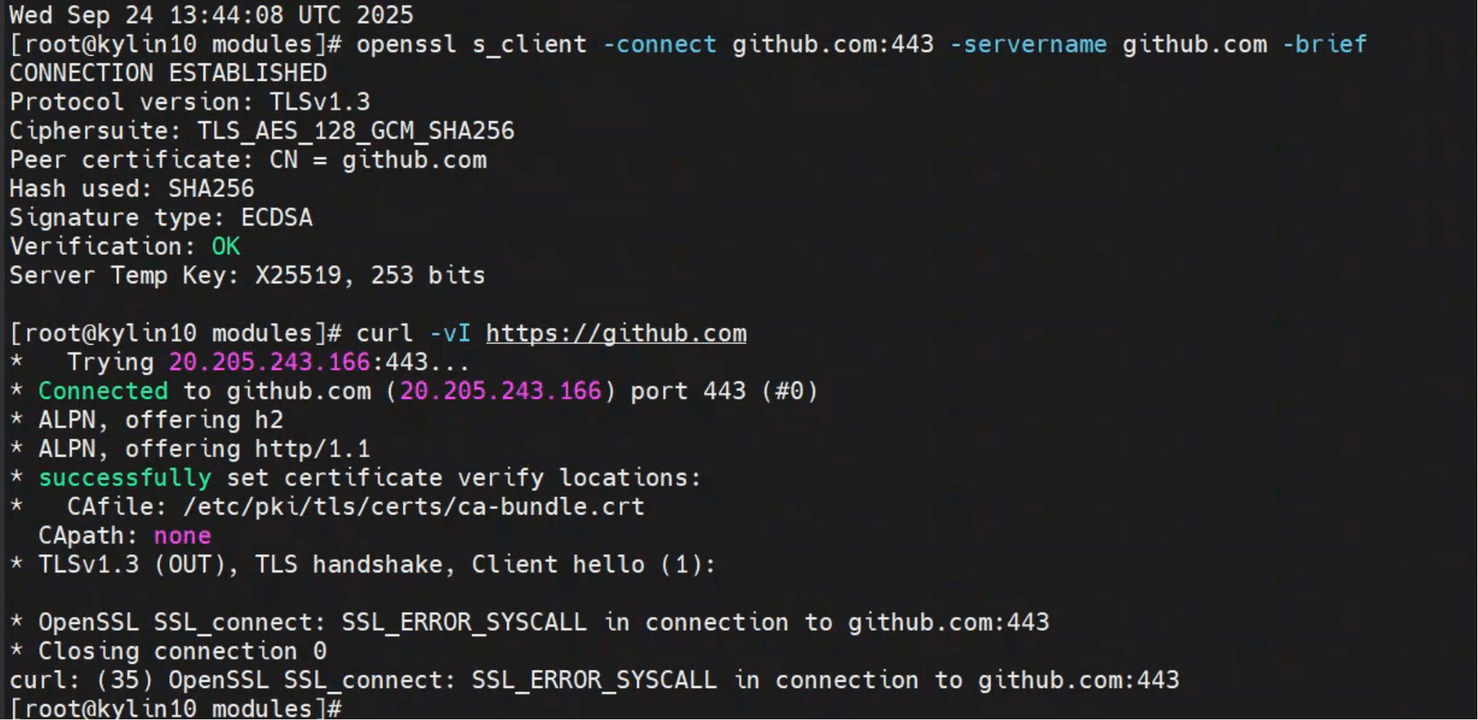 在 Kylin V10 / RHEL8 系统中,OpenSSL 默认启用了 TLS1.3。 但部分外部依赖仓库(尤其是老旧 Git 仓库或二进制下载站点),对 TLS1.3 握手过程支持不完整,导致连接中断。